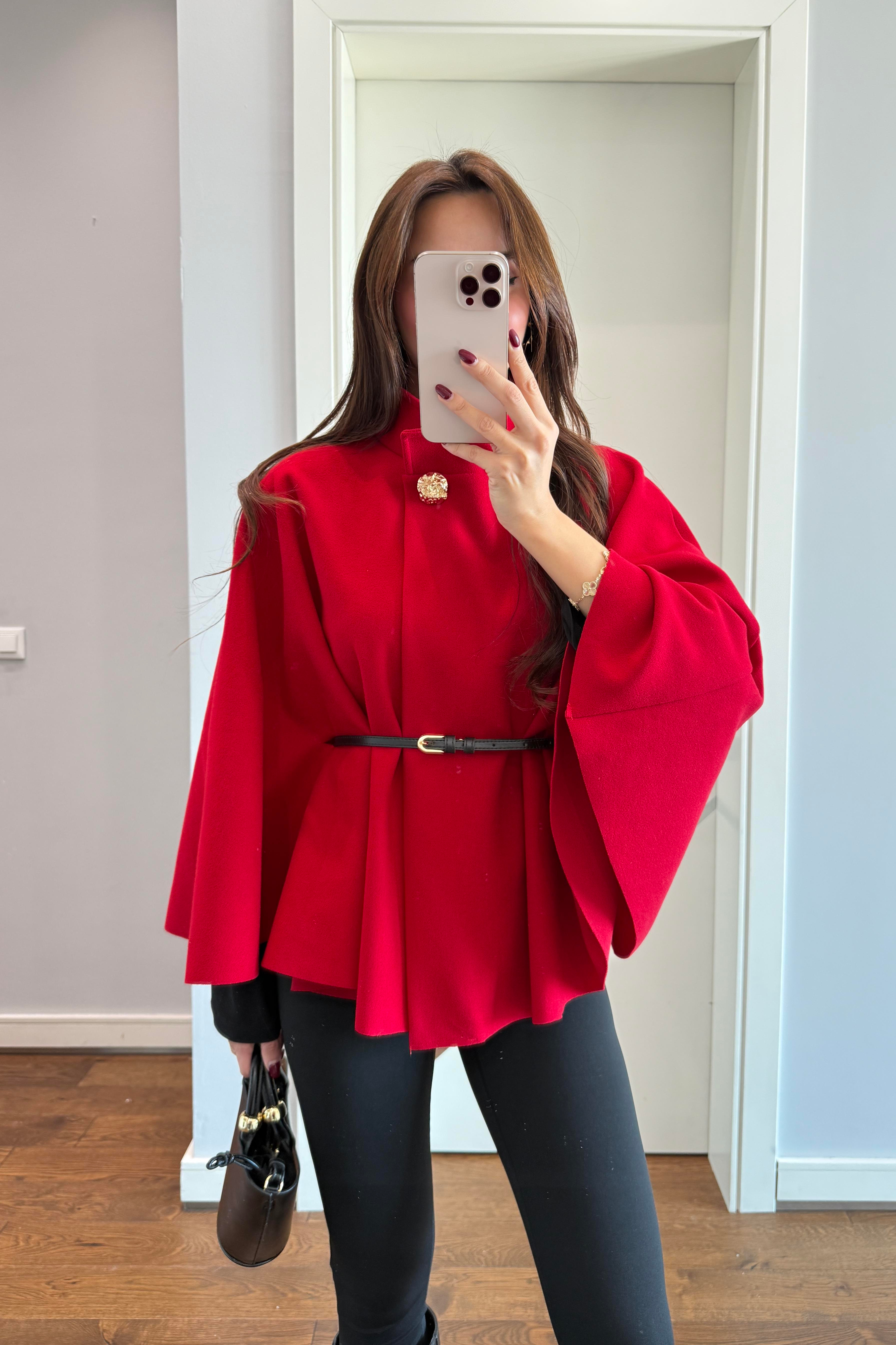 KAŞE KEMERLİ PANÇO-KIRMIZI